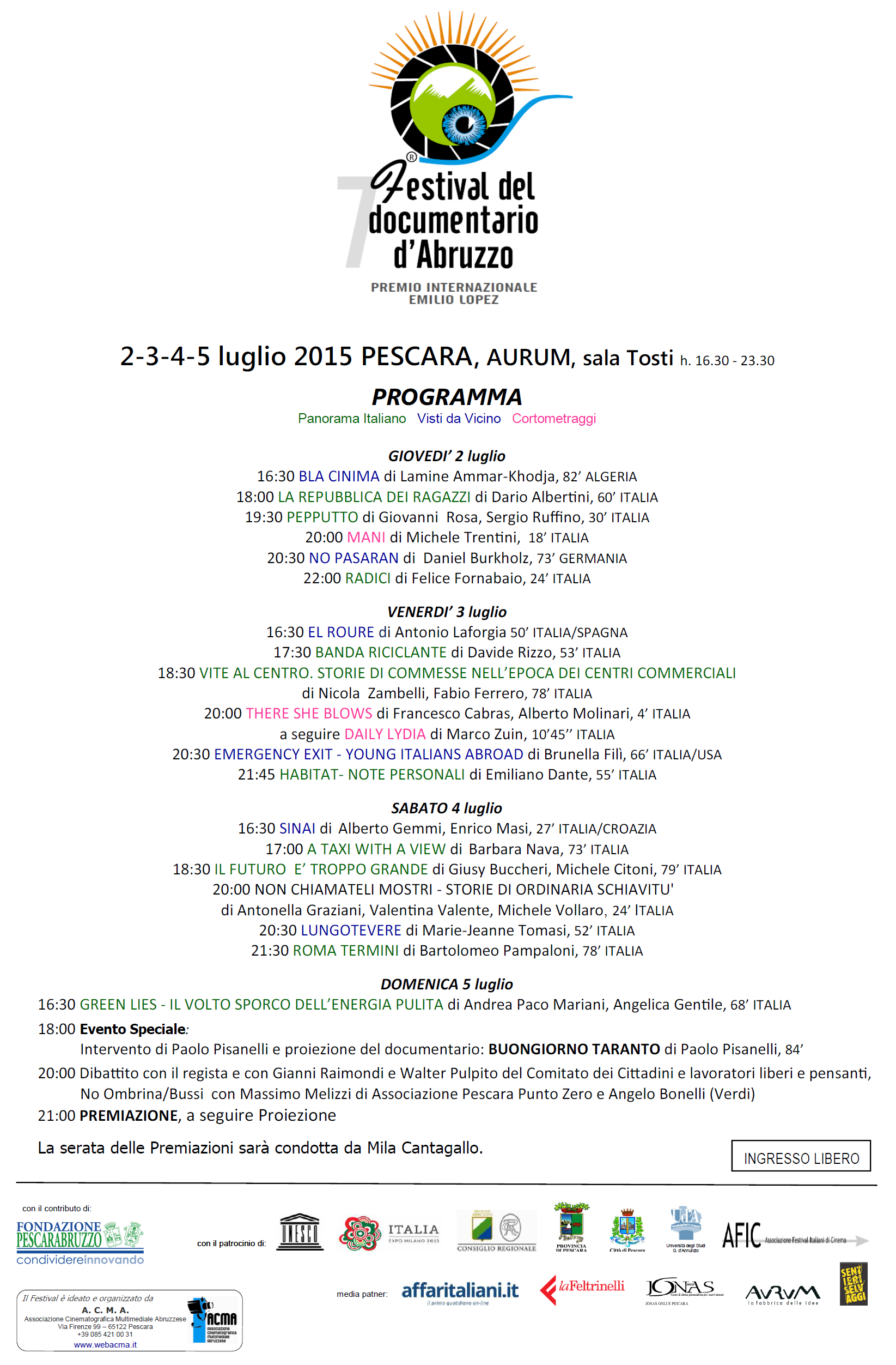 Il Festival è ideato e organizzato da A. C. M. A. – Associazione Cinematografica Multimediale Abruzzese Via Firenze 99 – 65122 Pescara – +39 085 421 00 31