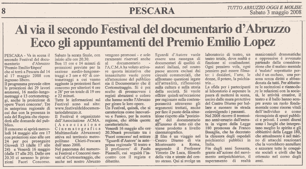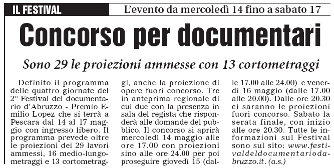 | 3 maggio | Abruzzo Oggi | Al via il 2° Festival del Documentario d’Abruzzo | |